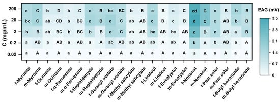 EAG response from different doses of volatiles. Different lowercase letters indicate significant differences between females and different uppercase letters indicate significant differences between males; f means females and m means males. (t-test, p < 0.05).