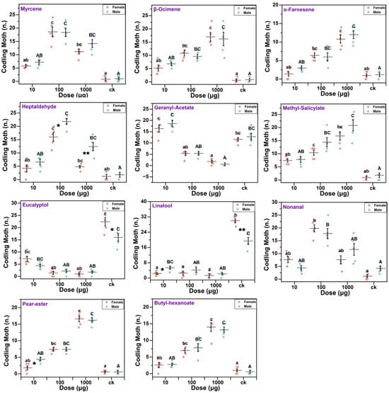 Olfactory response to different doses of compounds. Different lowercase letters indicate significant differences between females, different uppercase letters indicate significant differences between males (Wilcoxon test, p < 0.05), * represents significant differences between males and females (t-test, p < 0.05), and ** represents highly significant differences between males and females (t-test, p < 0.01).