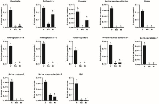 Expression profiles of venom genes of Habrobracon hebetor. V, venom apparatus; RB, residual body of female adult, female adult body deprived of venom apparatus; M, male adult. Significant differences (p < 0.05) are denoted using different letters above bars.