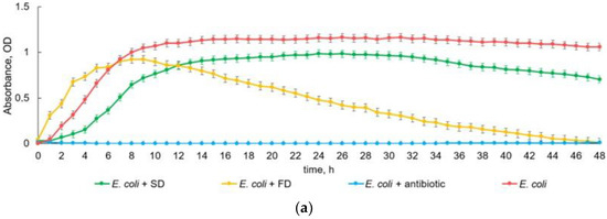The growth curves of Gram-positive cocci S. aureus and S. epidermidis (Figure 4b,c) had similar growth patterns to P. aeruginosa and S. abony, where, in the initial stages, the growth was suppressed under the influence of SD and FD. There was virtually no lag phase on the growth curve of the control culture of S. aureus: in the first hour of incubation, the culture entered the log phase for 8 h, followed by the stationary phase, which lasted 23 h, after which the culture slowly began to degrade. There was also virtually no lag phase on the growth curve of the control culture of S. epidermidis: in the first hour of incubation, the culture entered the log phase for 7 h; then, growth began to slow down and, by the beginning of the second day, it reached a plateau (stationary phase). For two cocci cultures, the growth inhibition in the presence of an SD sample lasted for 14 h, followed by a slowly ascending growth curve at the log growth phase and the slowing growth rate phase. Two graphs (for cocci S. aureus and S. epidermidis in Figure 4b,c) hade an intersection of growth curves of the negative control bacteria and bacteria with an SD sample. For the S. aureus culture, this point was at hour 37, and, for the S. epidermidis culture, it was at hour 42. For these bacteria, the SD sample served as a growth-stimulating nutrient substrate of a sort. As with Gram-negative bacteria, the FD sample was active for a longer time than the SD sample and slowed down the growth rate of cultures during two days of analysis. Optical density (reflecting bacterial concentration) was almost at the same level.