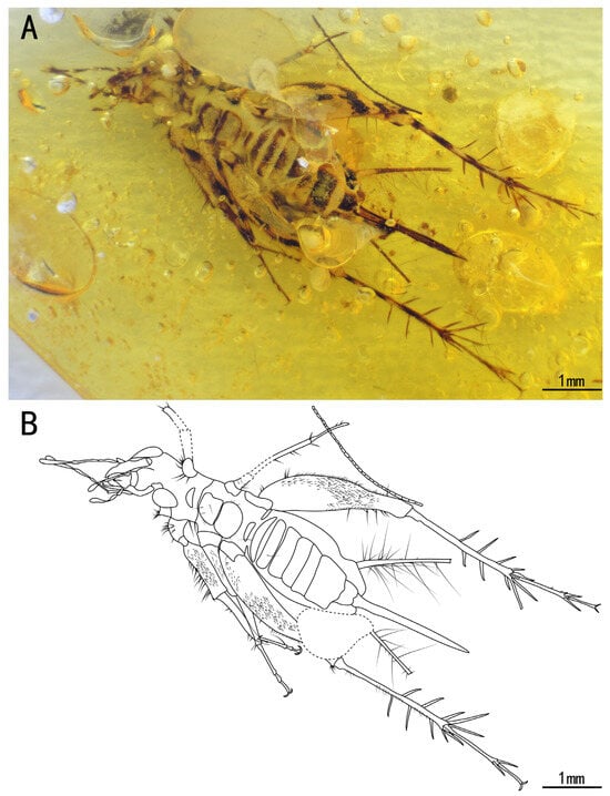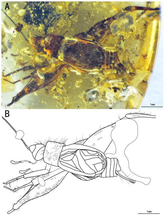 Habitus of Birmaninemobius hirsutus Xu et al., 2020, SICAU(A)-163: (A) photograph of dorsal view and (B) line drawing of dorsal view. Dotted line indicates obscured parts.
