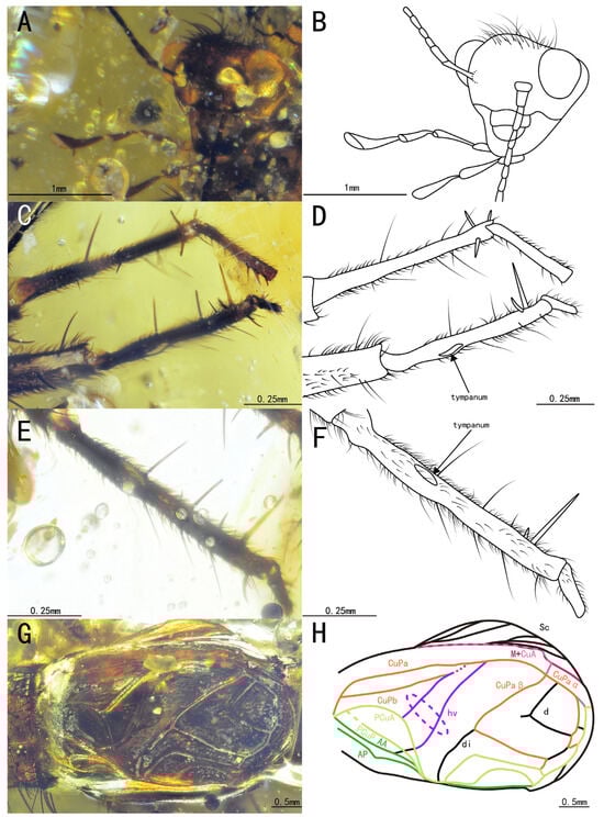Details of Palaeotrigonidium defectivus sp. nov.: (A) photograph of the head, (B) line drawing of the head, (C) photograph of the prothoracic leg and mesothoracic leg, (D) line drawing of the prothoracic leg and mesothoracic leg, (E) photograph of the prothoracic leg to show the outer tympanum, (F) line drawing of the prothoracic leg to show the outer tympanum, (G) photograph of the tegmina and (H) line drawing of the tegmina.