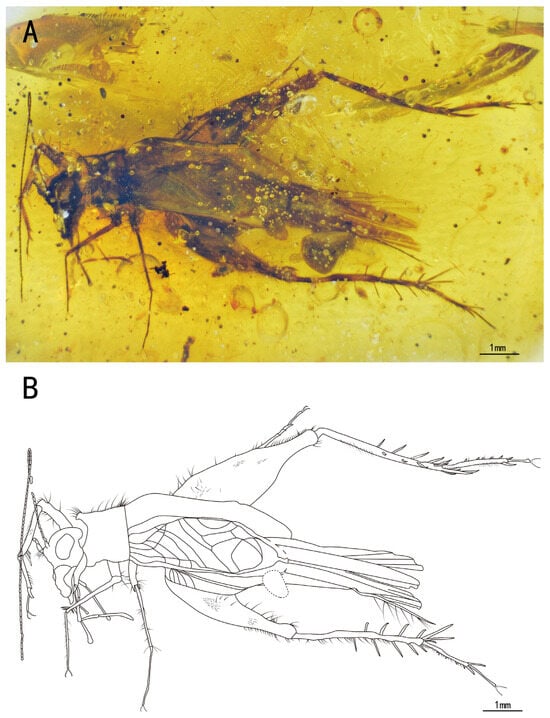 Habitus of Palaeotrigonidium defectivus sp. nov.: (A) photograph of dorsal view and (B) line drawing of dorsal view. Dotted line indicates obscured parts.