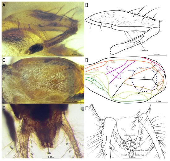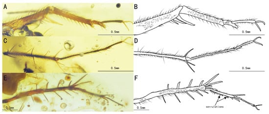 Remarks. B. hirsutus was initially assigned to Nemobiinae by the presence of a compressed second metatarsomere without adhesive pads (neither widened nor flat) and serrated claws and of a mirror similar to a common cell of the forewing’s apical field []. However, based on the triangular head, a longer than broad scape, and a protibia bearing just one long apical spur, Desutter-Grandcolas, et al. revised this classification and suggested that this species should be described as belonging to a stem group of Trigonidiidae []. We examined the holotype and the new specimen and found that some parts of the original description were inaccurate, such as those regarding the shape of the mirror and the presence of a median ocellus and the caption of the terminal abdominal (Figure 10C–F and Figure 11A–F). The specimen SICAU(A)-163 exhibits compound eyes that appeared more rounded and less pronounced compared to those of NIGP172331. Additionally, the ectoparamere of SICAU(A)-163 appeared more hook-like, while that of NIGP172331 appeared more flake-like (Figure 11E,F). It is hard to accurately assess the morphological differences of this skeletal structure in ambers; meanwhile, some membranous structures of the genitalia are often difficult to preserve. Furthermore, these differences may also be attributed to variations in photography angles and preservation conditions. However, as no distinct differences were observed in the apical spurs of the protibia, the apical and subapical spurs of the metatibia, the wing venation, and other features, we decided to temporarily consider it as a new material of B. hirsutus.