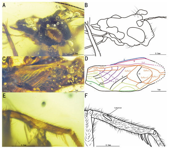 Details of Birmaninemobius hirsutus Xu et al., 2020, SICAU(A)-163: (A) photograph of the prothoracic leg to show the tympanum, (B) line drawing of the prothoracic leg to show the tympanum, (C) photograph of the tegmina, (D) line drawing of the tegmina, (E) photograph of the terminal abdomen, and (F) line drawing of the terminal abdomen.