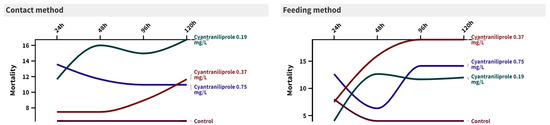 Mortality percentages of C. carnea at 24, 48, 96, and 120 h post-treatment with three concentrations (0.19, 0.37, and 0.75 mg/L) of cyantraniliprole using two different methods of exposure.