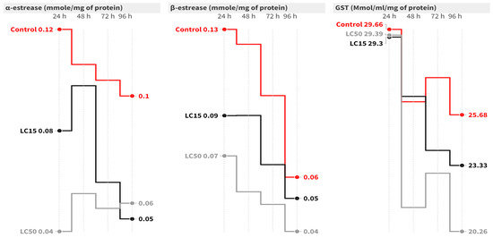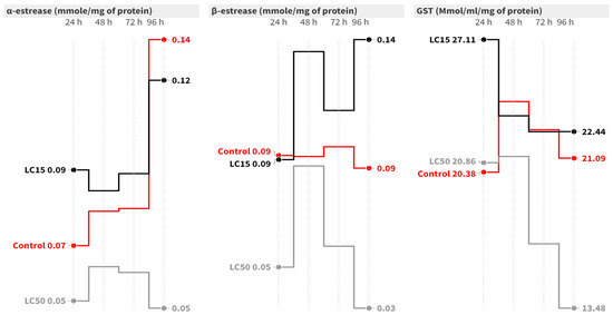 Mean of the detoxification enzyme activity of carboxylesterase (α- and β-esterase) and GST at 24, 48, 72, and 96 h post-treatment of S. littoralis second-instar larvae with LC15 and LC50 of cyantraniliprole.