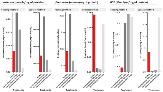 In the case of α-esterase activity, no significant interaction was detected between the treatment and administration method (Figure 4). Cyantraniliprole treatments insignificantly affected the activity, while no effect was recorded in the feeding method (F = 3.56, p = 0.067) or the contact one (F = 6.13, p = 0.018). As for β-esterase activity, the interaction between treatments and contamination methods was insignificant. Except in 0.19 mg/L-treated larvae in the feeding contamination method (F = 12.94, p = 0.002), there were significant differences when compared with the control. As for GST activity, in the feeding method, there was a significant difference (F = 3.92, p = 0.054), while in the contact method, there were no significant differences in GST activity (F = 0.89, p = 0.487) compared to the control treatment (Figure 4).