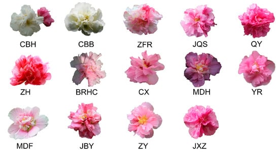 - Zhu, Z.; Zeng, X.; Shi, X.; Ma, J.; Liu, X.; Li, Q. Transcription and Metabolic Profiling Analysis of Three Discolorations in a Day of Hibiscus mutabilis. Biology 2023, 12, 1115. [Google Scholar] [CrossRef] [PubMed]
