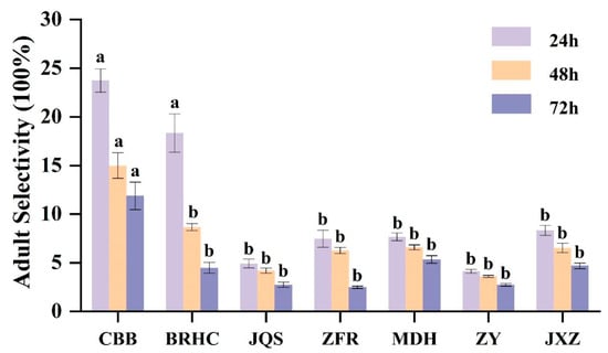 Based on the results from 2 years of field resistance screening, seven varieties (CBB, BRHC, JQS, ZFR, MDH, ZY, and JXZ) with differing resistance levels were selected for further evaluation of antixenosis and antibiosis. The preference of adult B. tabaci for these varieties showed significant differences (p < 0.05) at various time points (24, 48, and 72 h). Specifically, after 24 h, CBB exhibited the highest selection rate (23.73%), which significantly surpassed those of all other varieties except for BRHC (18.33%). This trend continued at 48 and 72 h, with preferences in descending order being CBB (11.87%), MDH (5.33%), JXZ (4.67%), BRHC (4.47%), and then JQS and ZY (2.73%), followed by ZFR (2.47%). Thus, CBB may have a weak antixenosis effect on adult B. tabaci, whereas ZFR, ZY, and JQS may exhibit stronger antixenosis effects (Figure 2).