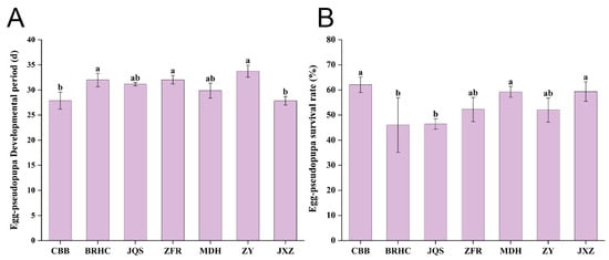 Antibiosis experiments were conducted at 25 °C ± 1 °C. Uniformly grown H. mutabilis seedlings were infested, and insects were allowed to lay eggs freely. Adults were removed 12 h post infestation, and egg counts were conducted. Following the method of Novaes et al. [25], leaves with uniformly distributed eggs were selected, retaining 30–50 eggs per leaf as one replicate. Excess eggs were gently removed with a brush, and eggs were monitored post-hatching every 24 h until adult emergence. The developmental duration and survival rate of B. tabaci at each insect stage on different H. mutabilis varieties were calculated, with three replicates of the experiment conducted.