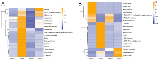 Comparative volatile metabolite profiles in healthy (H) or infested (I) H. mutabilis leaves under B. tabaci infestation. (A) highlights 17 metabolites present in both resistant (JQS) and susceptible (CBB) varieties, (B) contrasts 19 distinct metabolites in the two plant types. Color intensity reflects the volatile metabolite concentration-blue for lower, orange for higher.