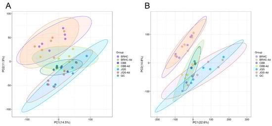 Principal component analysis (PCA) of volatile compound profiles in H. mutabilis smples. Scatter plots representing PCA scores of H. mutabilis samples analyzed in both (A) positive and (B) negative ion modes. Principal Component 1 (PC1) and Principal Component 2 (PC2) are plotted along the x-axis and y-axis, respectively, explaining 14.5% and 11.9% of the variance in A, and 22.6% and 14.8% in B. Each point corresponds to an individual sample, with distinct colors signifying different experimental groups. Ellipses denote the 95% confidence intervals for the group clusters, illustrating the variability and grouping within the data set.