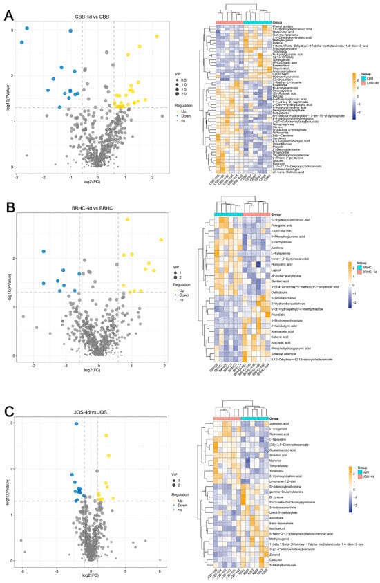 Differential metabolite expression in H. mutabilis in response to B. tabaci infestation. Volcano plots and hierarchical clustering heat maps illustrate the differential expression profiles of metabolites in H. mutabilis varieties and materials, respectively, in response to 4 days of B. tabaci infestation: the differential expression between the control and post-infestation (A) for the CBB variety, (B) for the JQS variety, and (C) for the BRHC variety. Left: volcano plots detail metabolite changes with log2 fold change (x-axis) and the −log10 p-value (y-axis), highlighting upregulated (in yellow) and downregulated (in blue) metabolites exceeding two-fold change with a p-value below 0.05, marked by dashed lines for change and significance thresholds. Right: heat maps show metabolite expression levels, from low (blue) to high (yellow), and feature dendrograms for clustering analysis of sample groups and metabolites.
