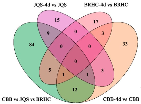 Comparative analysis of metabolite changes in H. mutabilis varieties following B. tabaci infestation. The Venn diagram depicts the comparative quantification of differential metabolites identified among the H. mutabilis varieties CBB, JQS, and BRHC when challenged with B. tabaci for 4 days. Each circle represents a comparison between the metabolite profiles pre-and post-infestation for a given variety: the green circle represents CBB vs. JQS vs. BRHC, the purple circle represents JQS-4d vs. JQS, and the pink circle represents BRHC-4d vs. BRHC. The orange circle represents CBB-4d vs. CBB. Overlapping regions indicate the number of metabolites that are differentially expressed in common between the different comparisons, while unique sections denote variety-specific changes.