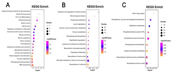 Pathway enrichment analysis of metabolic responses in H. mutabilis to B. tabaci infestation. Three bubble charts represent KEGG pathway enrichment based on metabolomics data from H. mutabilis varieties post B. tabaci infestation. (A) CBB compared with its four-day post-infestation state (CBB-4d), (B) BRHC-4d compared with BRHC, and (C) JQS-4d compared with JQS. Each bubble in the charts indicates a specific metabolic pathway, with color showing the significance level (−log10 p-value), size reflecting the number of enriched metabolites, and position on the x-axis (Impact) illustrating the pathway influence based on topology-analysis-derived impact scores.