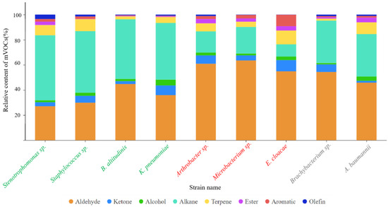 We analyzed the mVOCs produced by nine different bacterial strains, identifying forty-one mVOCs (Table A1), which we categorized into eight distinct chemical classes (Figure 2). Notably, the aldehydes and alkanes had the highest percentage of total abundance among all the compounds, about 46.32% and 34.28%. Following these are terpenes and ketones, whose combined relative content amounted to roughly 6.0% and 5.5%, respectively. As shown in Figure 2, the aldehydes exhibited a significantly higher relative content in the “avoided” strains than other bacterial strains, whereas their content was relatively lower in the “attractive” strains. For the “neutral” strains, the relative content of both the alkanes and aldehydes fell between those of the “attractive” and “avoided” strains.
