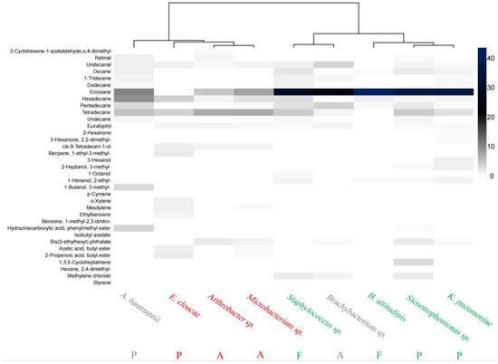 Heat map showing clusters of mVOCs commonly present in nine strains. Note: the horizontal coordinate is the name of the bacteria, and the vertical coordinate is the relative content of the shared mVOCs; the darker the color in the graph, the higher the relative content; A: Actinobacteria, P: Proteobacteria, and F: Firmicutes; “attractive” strains were identified in green, “avoided” strains were identified in red, and “neutral” strains were identified in gray.