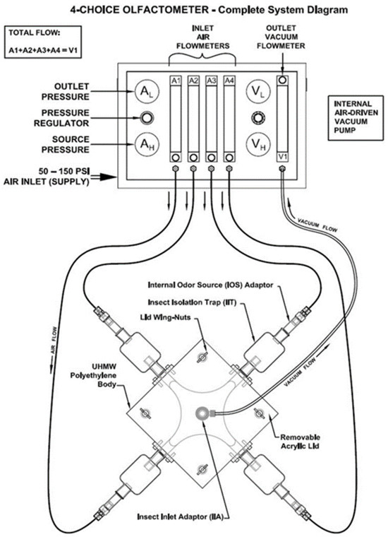The primary choice arena of the olfactometer, measuring 30.48 × 30.48 × 2.54 cm, was topped with a removable lid. It included four outlet ports connected laterally to four odor source chambers and a ventral insect inlet port for introducing the test insect. Each lateral outlet port was linked to the internal odor source (IOS) using a glass insect isolation trap (IIT). The odor source was connected to an air delivery system that pumped moist air through the odor sources into the choice arena and used a vacuum to centralize airflow in the insect inlet chamber. The air delivery rate was 1 L/min. Air from all odor sources was directed to the insect inlet chamber using a vacuum suction mechanism, exposing the test insect to odors from different chambers, allowing it to make a choice. [Image source: Research Facility Solutions, LLC, Gainesville, Florida 32609 (https://rfsolutions.tech/index.html) (assessed on 4 June 2024) {formerly owned by ARS, Gainesville, Florida} (https://www.ars-fla.com/index.html) (assessed on 4 June 2024)].