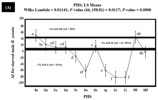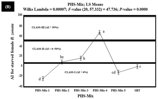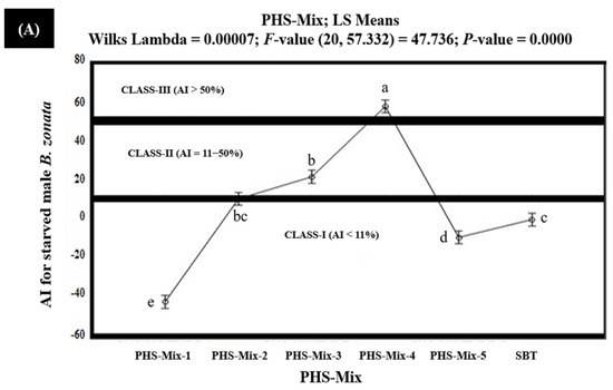 The ANOVA parameters explained that PHS-AdMix had significant effects (p < 0.05) on the attractancy index for the fed and starved batches of male and female B. zonata when PHS-AdMix were evaluated in the olfactometer under laboratory conditions (Table 4).