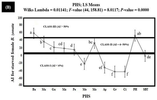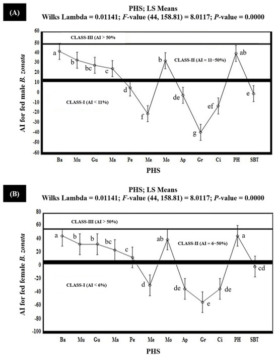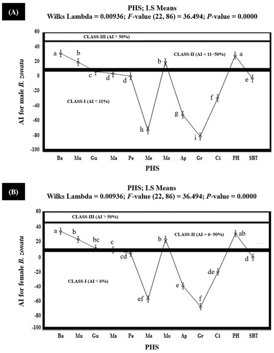 Attractancy indices (AIs) (%) of different PHS (Ba: Banana; Mu: Mulberry; Gu: Guava; Ma: Mango; Pe: Peach; Me: Melon; Mo: Molasses; Ap: Apple; Gr: Grapes; Ci: Citrus; PH: Protein Hydrolysate; SBT: Standard Bait Trap) for male (A) and female (B) B. zonata under field conditions. AI of SBT (GF-120) is zero because it was used as a standard. Bars indicate 95% confidence intervals (as the ranges of upper and lower limits of CIs for mean values of each PHS did not overlap; so, AIs of PHS varied significantly from each other). Means sharing similar style letters do not significantly differ at probability level of 5%.