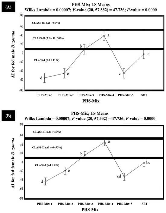 Attractancy indices (AIs) (%) of different PHS-Mix (PHS-Mix-1: Phagostimulants-Mixture-1; PHS-Mix-2: Phagostimulants-Mixture-2; PHS-Mix-3: Phagostimulants-Mixture-3; PHS-Mix-4: Phagostimulants-Mixture-4; PHS-Mix-5: Phagostimulants-Mixture-5; SBT: Standard Bait Trap) for male (A) and female (B) B. zonata under field conditions. AI of SBT (GF-120) is zero because it was used as a standard. Bars indicate 95% confidence intervals (as the ranges of upper and lower limits of CIs for mean values of each PHS-Mix did not overlap; so, AIs of PHS-Mix varied significantly from each other). Means sharing similar style letters do not significantly differ at probability level of 5%.