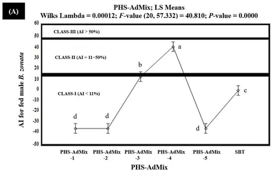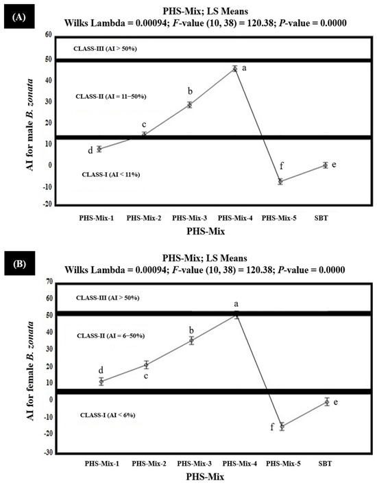 The results of the field study indicated that among the tested PHS-AdMix, PHS-AdMix-4 demonstrated strong attractiveness (Class-III with AI > 50%), exhibiting 58.7% and 52.7% AIs for the female and male B. zonata. PHS-AdMix-3 demonstrated 50.7% AI and proved to be strongly attractive (Class-III with AI > 50%) for the female B. zonata. But the same (PHS-AdMix-3) explained 43.7% AI and proved to be moderately attractive (Class-II with AI 11–50%) for the male B. zonata. PHS-AdMix-2 proved to be moderately attractive (Class-II), exhibiting 32.9% and 23.6% AIs for the female and male B. zonata, respectively. Similarly, PHS-AdMix-1 proved to be moderately attractive (Class-II), exhibiting 25.9% and 18.3% AIs for the female and male B. zonata, respectively. Unexpectedly, PHS-AdMix-5 explained the 5.5% AI and proved to be non- or minimally attractive (Class-I with AI < 6%) for the female B. zonata. But the same (PHS-AdMix-5) demonstrated 6.6% AI and proved to be the least attractive (Class-I) for the male B. zonata. Overall, PHS-AdMix-4 proved to be better that PHS-AdMix, followed by PHS-AdMix-3, PHS-AdMix-2, and PHS-AdMix-1 under field conditions (Figure 10 and Table S3).
