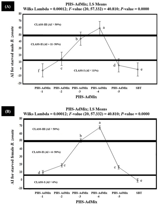 The results of the in vitro olfactometric tests indicated that among the tested PHS-AdMix, PHS-AdMix-4 demonstrated strong attractiveness (Class-III with AI > 50%), exhibiting 70.7% and 64.4% AIs (AI > 50%) for the starved female and male B. zonata, respectively (Figure 8). However, PHS-AdMix-4 exhibited 41.3% and 36.6% AIs for the fed female and male B. zonata, respectively, and proved to be moderately attractive (Class-II with AI 6–50%) for the fed B. zonata (Figure 9).