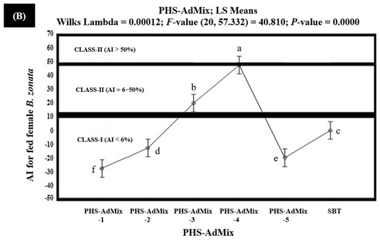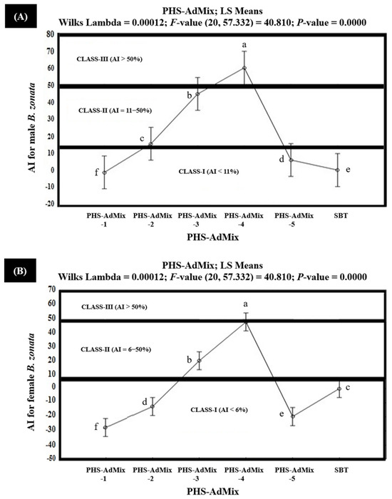Attractancy indices (AIs) (%) of different PHS-AdMix (PHS-AdMix-1: Phagostimulants-AdMixture-1; PHS-AdMix-2: Phagostimulants-AdMixture-2; PHS-AdMix-3: Phagostimulants-AdMixture-3; PHS-AdMix-4: Phagostimulants-AdMixture-4; PHS-AdMix-5: Phagostimulants-AdMixture-5; SBT: Standard Bait Trap) for male (A) and female (B) B. zonata under field conditions. AI of SBT (GF-120) is zero because it was used as a standard. Bars indicate 95% confidence intervals (as the ranges of upper and lower limits of CIs for mean values of each PHS-AdMix did not overlap; so, AIs of PHS-AdMix varied significantly from each other). Means sharing similar style letters do not significantly differ at probability level of 5%.