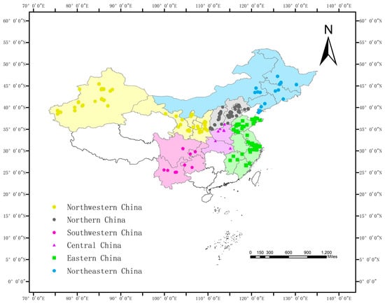 As of October 2023, a total of 204 literature sources related to the phenology data of G. molesta were identified in the CNKI database and Web of Science (Table S1), covering six regions: central China, eastern China, northeastern China, northwestern China, northern China, southwestern China as well as 25 provinces, including Beijing, Hebei, Shanxi, Gansu, Shaanxi, and Heilongjiang, etc. (Table S2, Figure 1). Hebei Province has the highest number of valid records, defined by individual observation dates, succeeded in order by Shanxi, Shandong, Gansu, and Xinjiang. Due to insufficient data on the five phenological indicators in central China, this study excluded the analysis of this region.