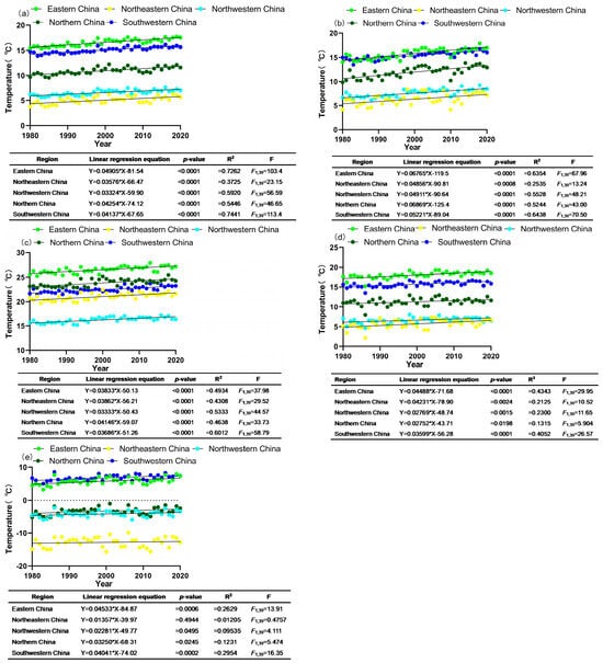Since 1980, a significant increase in the annual average temperature was observed across eastern China, northeastern China, northwestern China, northern China, and southwestern China. Eastern China had the highest warming rate, while the lowest was recorded by northwestern China (Figure 2a). According to research conducted between 1980 and 2020, a significant increase in the average temperature in spring, summer, and autumn occurred in five regions. The highest spring warming rate was in northern China, and the lowest was in northeastern China (Figure 2b). The highest rate of average temperature rise in summer was in the northern China region, and the lowest was in the northwestern region (Figure 2c). The region with the highest autumn warming rate was eastern China, while the region with the lowest warming rate was northern China (Figure 2d). A remarkable upward trend in the average winter temperature in five regions was shown, except for the northeastern region. The fastest warming rate was in eastern China, and the lowest warming rate was in northeastern China (Figure 2e).