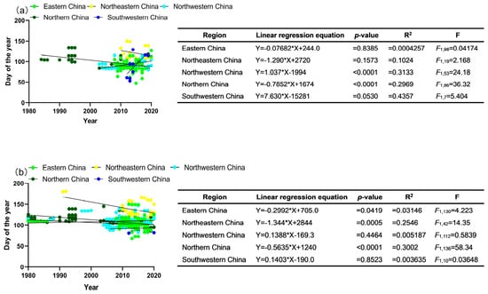 Regarding the trends observed, the FOCA in eastern China, northwestern China, and northern China showed an insubstantial advance. On average, there was an advance of 0.4 ± SE 1.8 days, 0.9 ± SE 0.6 days, and 0.2 ± SE 0.2 days, respectively. However, inadequate data prevented the analysis of the index for the northeastern and southwestern regions (Figure 4a).