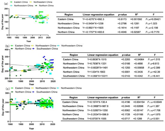 Linear regressions between the first occurrence date (a), end occurrence date (b), and population peak date (c) of contemporary adults and time (years) for G. molesta in five regions in China. The solid lines represent the changing trends of the phenophase parameters, while small circles indicate various phenological records.
