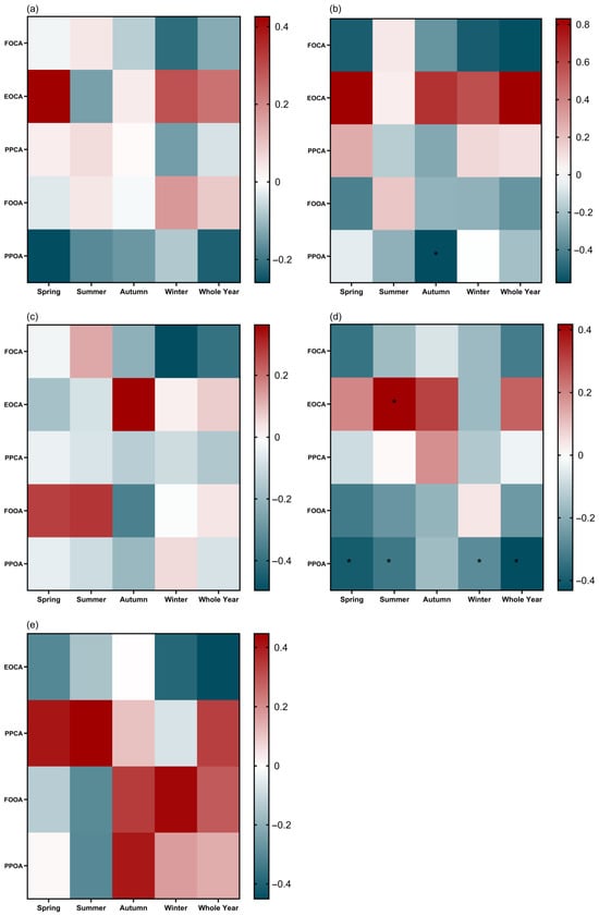 In eastern China, northwestern China, and southwestern China, no significant correlations were observed between phenological indexes and mean temperatures across the four seasons (Figure 5a,c,e). However, in northeastern China, the population peak date of overwintering adults (PPOA) showed a significant negative correlation with mean temperature in autumn (r = −0.5754, Figure 5b). Conversely, the end occurrence date of contemporary adults (EOCA) in northern China exhibited a significant positive correlation with mean temperature in summer (r = 0.4172, Figure 5d). Additionally, significant negative correlations were found between PPOA and the average temperatures of spring (r = −0.3997), summer (r = −0.3313), winter (r = −0.2838), and annually (r = −0.4319, Figure 5d). Data insufficiency impeded the analysis of the first occurrence date of contemporary adults (FOCA) and EOCA in northeastern and southwestern China as well as the first occurrence date of overwintering adults (FOOA) in southwestern China, as shown in Figure 5b,e.