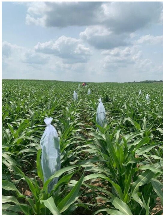 Based on preliminary field experiments conducted in the summer of 2020, various sorghum plots did not reach sorghum aphid economic threshold levels for insecticide applications. For this reason, we manually infested 8 random, individual plants with approximately 200 wingless aphids in the two middle rows of each individual plots when the sorghum plants had 7–10 leaves (stage 3) during the growing seasons of 2021 and 2022, respectively (Figure 1). Sorghum aphids were obtained from a research colony maintained at the Entomology Department of Kansas State University, which was established in 2020 from field-collected aphid populations. After randomly selected sorghum plants were infested, each plant was covered with sleeve cages. Each cage was 50 cm long by 20 cm wide with two openings at the ends built with noseeum mesh long enough to allow for plant growth development while protecting the aphids from natural enemies, especially coccinellids (Figure 2). All sleeve cages were removed two weeks before visual assessments started, which allowed sorghum aphids to spread through the center two rows of each replicate plot.