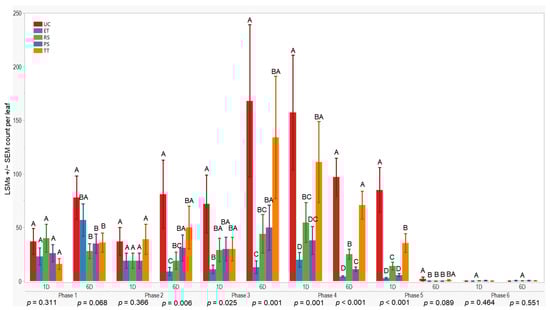 Initially, all treatments showed similar results one day after application in the first evaluation phase (p = 0.571). However, after six days, treatment differences occurred (p = 0.003). TT exhibited higher aphid counts 178 ± 32 (LSM ± SE), while RS had lower counts compared to the others. UC differed from ET, PS, and TT but was similar to RS during the initial evaluation.