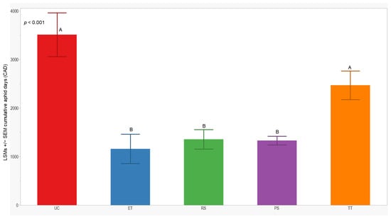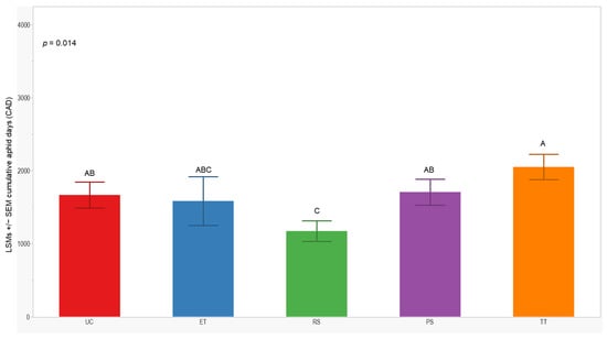 We observed significant differences in cumulative aphid days (CADs) across both years (p = 0.014; <0.001). In 2021, the separation of least-squares means (LSMs) for CADs indicated that the number of plots managed with the RS treatment was significantly lower (1173 ± 142) than those managed with the UC, PS, and TT treatments. In 2022, the CADs in the ET, RS, and PS treatments was significantly lower (≤1357 ± 200) compared to the UC and TT treatments (Figure 5 and Figure 6).