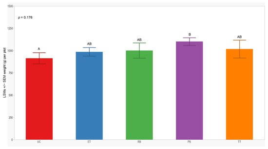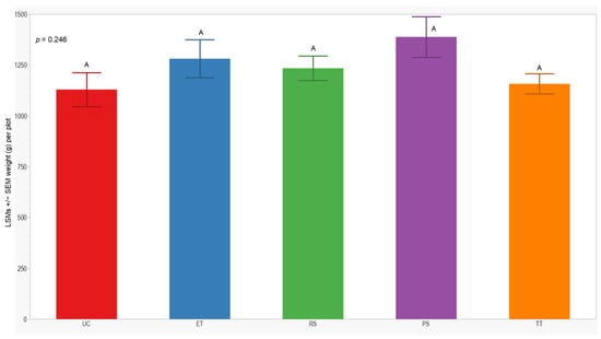 Figure 7. LSMs with SEs of yield in the 2021 season. LSMs with the same letter are not significantly different from each other (p > 0.05).