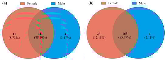 Venn diagram based on the genera (a) and species (b) of intestinal bacteria from two sexes of Pardosa astrigera.