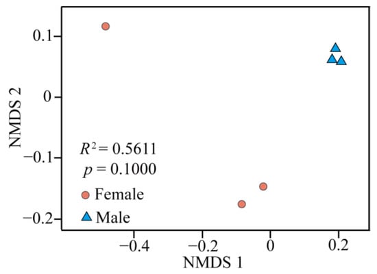 Non-metric multidimensional scaling (NMDS) based on the detected OTUs across the samples indicated that the male bacterial communities were well separated from those of females, even though the results of the permutational multivariate analysis of variance showed that there was no significant difference between the two sexes (p = 0.1000, R2 = 0.56; Figure 2). Moreover, the samples from the males were closely clustered, while those from the females were rather dispersed.