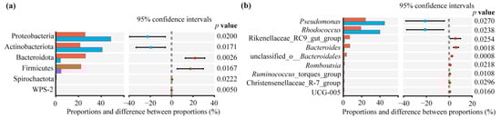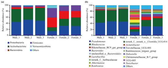 The relative abundance of dominant intestinal bacteria (>1%) showed sex differences at the level of different taxa (Figure 3). At the phylum level, a total of 17 phyla were identified, among which Proteobacteria, Actinobacteriota, Bacteroidota, and Firmicutes were the dominant phyla in both sexes (Figure 3a). At the genus level, a total of 126 genera were found from the data, among which 16 dominant genera were found in females, and six dominant genera were found in males (Figure 3b). The results of the independent t-test showed that the relative abundances of Pseudomonas (belonging to Proteobacteria) and Rhodococcus (belonging to Actinobacteriota) in males were significantly higher than in females (p < 0.05), while these of the other seven dominant genera, including Rikenellaceae RC9 gut group and Bacteroides (all belonging to Bacteroidota), were significantly higher in females than in males (p < 0.05, Figure 4b). No significant differences (p > 0.05) were found in the dominant genera between the two sexes except for those shown in Figure 3.