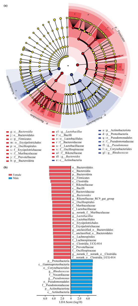 Consistent with the community composition, the bacterial communities between females and males were significantly different according to the results of the LEfSe analysis of the relative abundance of bacterial biomarkers. Six genera, including Bacteroides (from phylum to genus) and Lactobacillus (from phylum to genus), were significantly enriched in females, and Pseudomonas (from order to genus) and Rhodococcus (from phylum to genus) were significantly enriched in males (LDA score > 4, p < 0.05; Figure 5a,b).