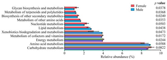 The results of the functional predictions of intestinal bacteria using PICRUSt2 analysis identified 11 level-2 pathways related to key metabolic functions (Figure 6). Among them, glycan biosynthesis and metabolism, the biosynthesis of other secondary metabolites, the metabolism of cofactors and vitamins, and the energy metabolism were significantly higher in females than in males (p < 0.05), while the metabolism of terpenoids and polyketides, the metabolism of other amino acids, the lipid metabolism, and the xenobiotics biodegradation and metabolism were significantly lower in females than in males (p < 0.05).