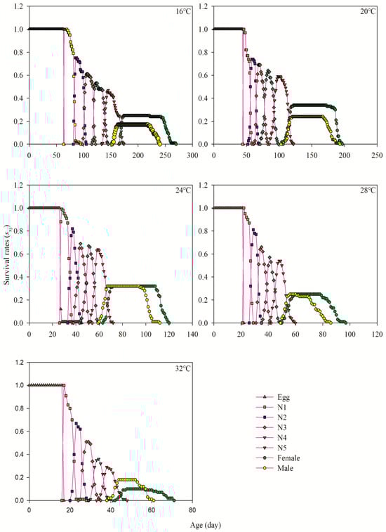 Results showed that A. lata was able to complete all its stages from eggs to adult at all temperatures. No clear overlap was found in the age-stage–survival curves, which considers the individual differences in developmental rates under different temperatures. The hatching rate of eggs was more than 90% at 20~28 °C. The highest and lowest survival rates of female adults were 20 °C (34%) and 32 °C (10%), respectively, while the highest and lowest survival rates of adult male were 24 °C (32%) and 16 °C (17%), respectively (Figure 1).