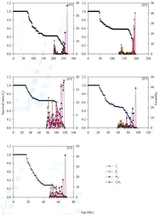 Age-specific survival (lx), age-stage-specific fecundity (fx), age-specific fecundity (mx), and age-specific maternity (lxmx) of A. lata at different temperatures.