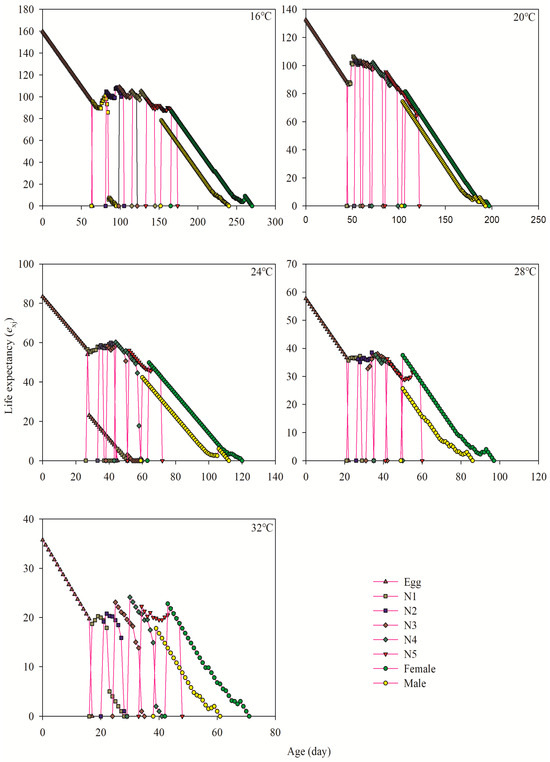 The life expectancy (exj) value of the same stage decreased as the temperature increased, while the exj value of the same stage gradually declined as the age increased. According to the data presented in Figure 3, the maximum life expectancy for adult females was determined at a temperature of 16 °C, with a value of 86.56 days. Conversely, the minimum life expectancy was recorded at a temperature of 32 °C, with a value of 22.80 days. Similarly, male adults showed the highest average life expectancy at 16 °C (78.29 days), whereas the shortest life expectancy was observed at 32 °C (17.78 days, Figure 3).