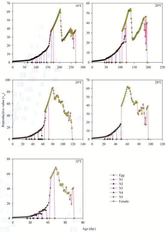 Reproductive value (vxj) of each age-stage group of A. lata at different temperatures. N1–N5 represent the first, second, third, fourth, and fifth instar, respectively.
