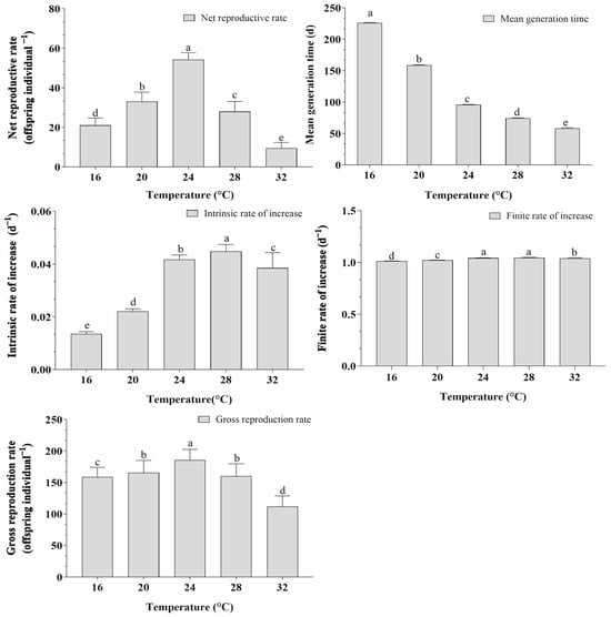The parameters for A. lata population are listed in Figure 5. The mean generation time (T) was longest at 16 °C (226.00 ± 0.70 days) and shortest at 32 °C (58.26 ± 1.05 days). The intrinsic growth rate initially increased and then decreased with rising temperature, peaking at 28 °C. Within a certain range, an increase in temperature can boost the population growth rate, but excessively high temperatures are detrimental to population growth. Between 24 °C and 28 °C, there was no significant difference in the finite rate of increase (λ) of the population. The highest net reproductive rate (R0) and total reproductive rate (GRR) were observed at 24 °C (54.26 ± 8.49 offspring and 185.53 ± 16.94 offspring, respectively), while the lowest were at 32 °C (9.43 ± 2.91 offspring and 111.80 ± 16.80 offspring, respectively).