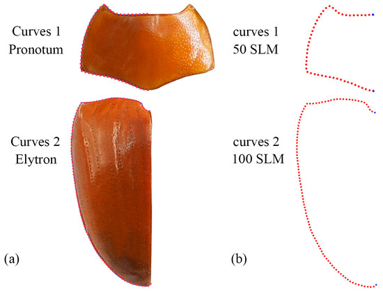 Description of the curves (a) and semi-landmarks (SLM) (b) of the pronotum and elytron used in the geometric morphometric analysis (Neotriplax miwai). The blue dots stand for starting and ending points.