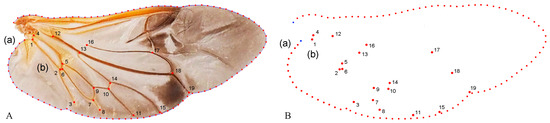 Description of the curves of the wing shape (A(a)) and semi-landmarks (SLM). (B(a)); Distribution of veins (A(b)) and 19 landmarks (B(b)) in the wing used in the geometric morphometric analysis (Neotriplax arisana). The blue dots stand for starting and ending points.